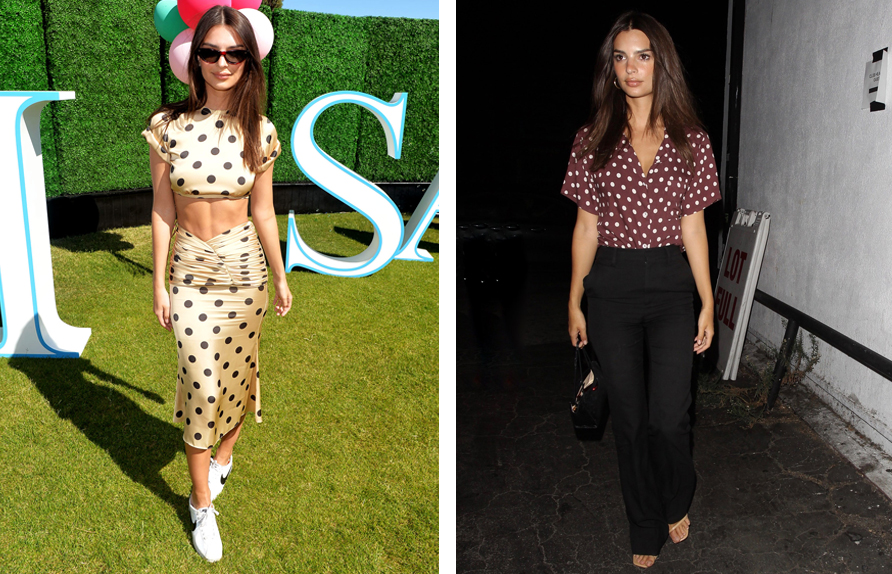 For those looking add more expression to their look, it can be an interesting thought to go for polka dot skirts, tops or even matching separates as spotted here on Emily Ratajkowksi. The best part of putting such an outfit together is that these round discs add enough edge to your look as is.
